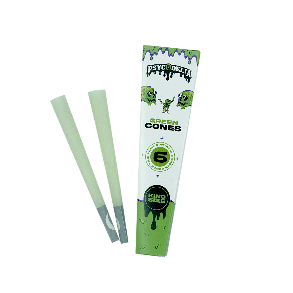 Disfruta de una experiencia premium con los conos KS Slim de Psycodelia. Disponibles en tres modelos únicos: Hemp Paper, Blue Paper y Green Paper, cada pack incluye 6 conos en tamaño king size, listos para usar.